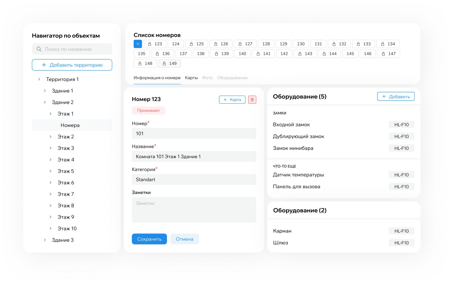 Территории, здания, этажи, категории и типы комнат — гибкая модель объекта, которая ложится на реальную структуру отеля