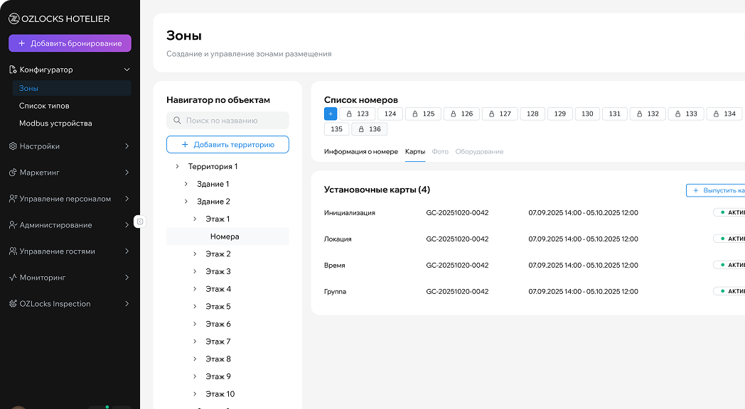 Территории, здания, этажи, категории и типы комнат — гибкая модель объекта, которая ложится на реальную структуру отеля